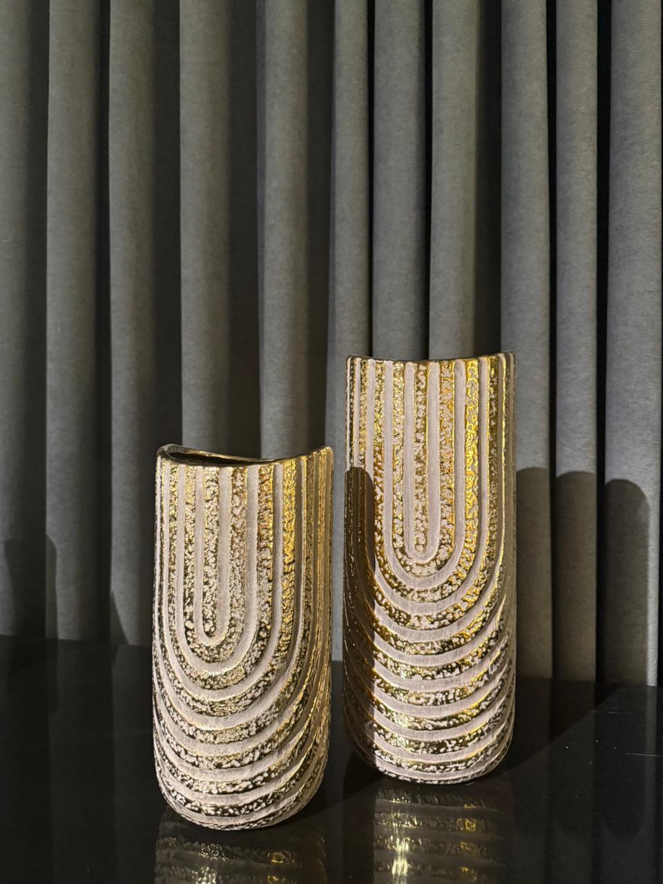 A pair of elegant, gold-accented vases with a textured, ridged design, it has glossy finish perfect for adding a touch of luxury to any room.